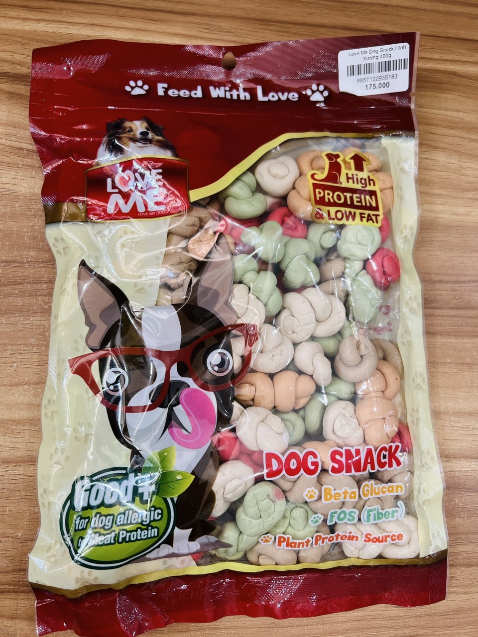 Snack Love Me Dog rất mềm, giàu đạm và chứa một hỗn hợp các thành phần lành mạnh. Nó được chế biến đặc biệt để có mùi thơm ngon và hương vị tuyệt vời mà con chó của bạn sẽ yêu thích. -Beta Glucan duy trì hệ thống tiêu hóa và miễn dịch của chó có sức khỏe tốt -Prebiotic làm giàu với Fructo-Oligosaccharide (Fiber) thúc đẩy hệ tiêu hóa và bài tiết. -Hương vị của sản phẩm LOVE ME đã được nghiên cứu kỹ lưỡng để thỏa mãn sở thích của chó.Snack cung cấp đồ ăn nhẹ cho chó khỏe mạnh với các thành phần chất lượng cao. Thành phần: Bột mì, dầu cọ, Beta Glucan, Fructo-Oligosaccharide (Sợi), Gluten lúa mì, Glycerine, Propylene Glycol, Màu thực phẩm, Hương vị, Chất bảo quản Phân tích được đảm bảo: Tối thiểu 20% PROTEIN, tối thiểu 5% chất béo, tối đa 2% chất xơ, tối đa 25% Độ ẩm.