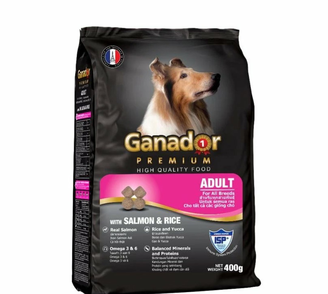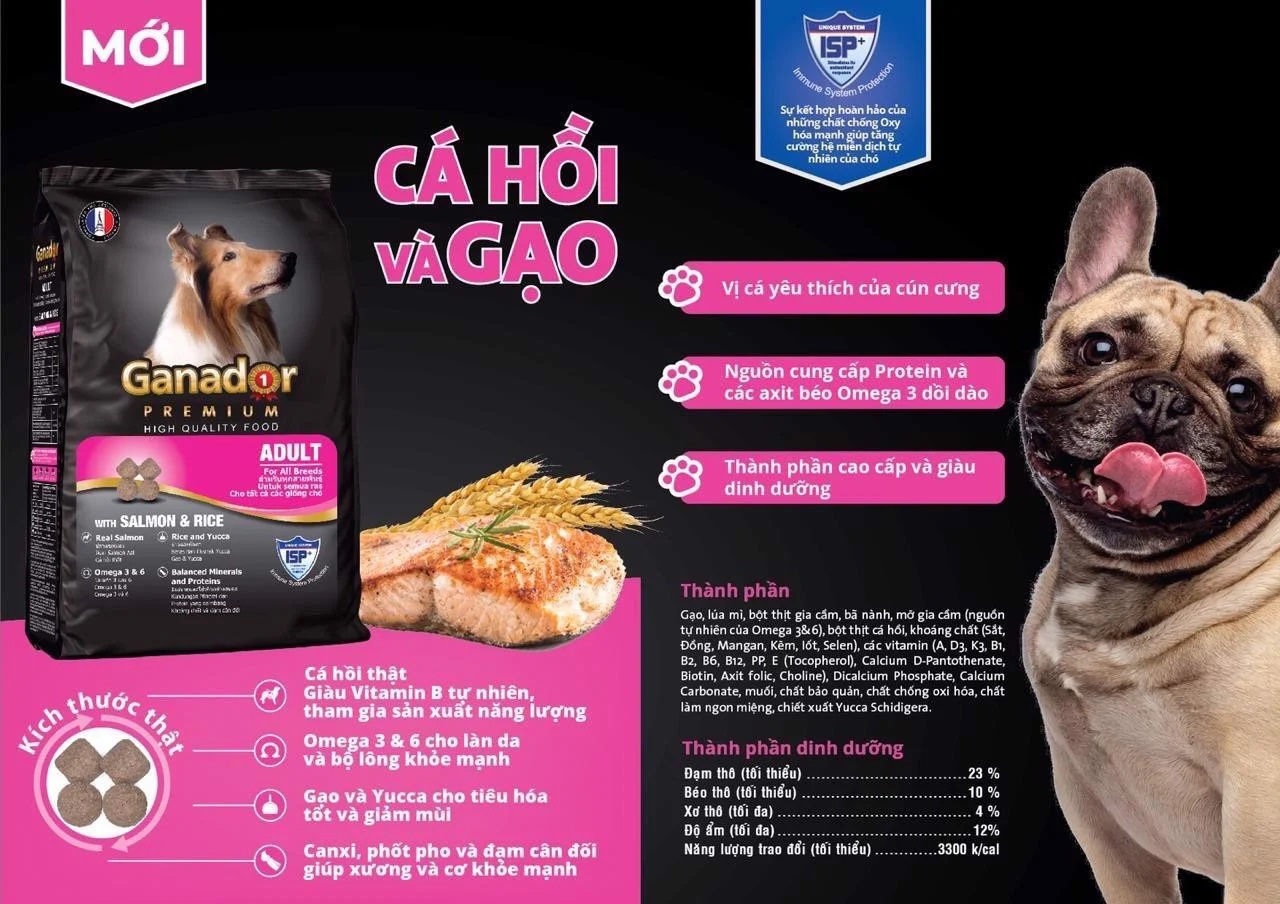 - Hạt Ganador Adult Salmon and Rice , Ganador Adult Lamb & Rice được làm từ cá thật, thịt thật giàu vitamin B tự nhiên, tham gia sản xuất năng lượng. Bổ sung O 3 và 6 cho làn da và bộ lông khỏe mạnh. Thành phần gạo và yucca cho tiêu hóa tốt và giảm mùi chất thải. Canxi, phốt pho và đạm cân đối giúp xương và cơ khỏe mạnh.