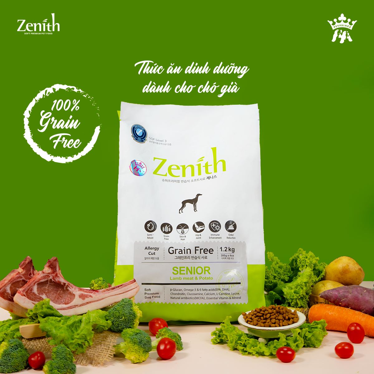 Chiết xuất từ cây ngọc giá giúp giảm bớt mùi phân ở các chú chó. Lượng calo cao và ít mỡ của thịt cừu tươi rất tốt cho hệ tim mạch. Gạo lứt làm giảm cholesterol, bảo vệ hệ tim mạch, cải thiện chức năng gan, giúp cơ thể đào thải những chất độc có hại. Zenith Large Breed được chế biến dưới dạng hạt mềm, độ ẩm cao hơn thức ăn hạt khô thông thường, lượng muối thấp, rất dễ nhai và dễ tiêu hóa.